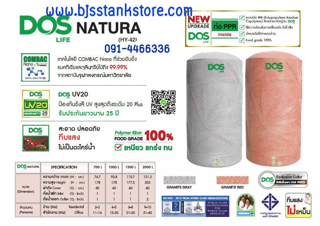 นวัตกรรมแห่งเทคโนโลยีถังเก็บน้ำเพื่อสุขอนามัย DOS Combac Nano ที่มีคุณสมบัติยับยั้ง ทำลายแบคทีเรียและ จุลินทรีย์ ล้ำหน้าเหนือกว่าด้วยมาตรฐานการตรวจสอบจากสถาบันต่างๆจากนานาประเทศ ด้วยรูปแบบที่เน้น ความลงตัวกลมกลืนกับธรรมชาติ วัสดุ Polymer Elixir