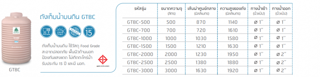 | GTBC - 3000 L | 3000 ลิตร | 1.63 x 1.92 | Ø 1" | Ø 2" | สอบถามราคา |
